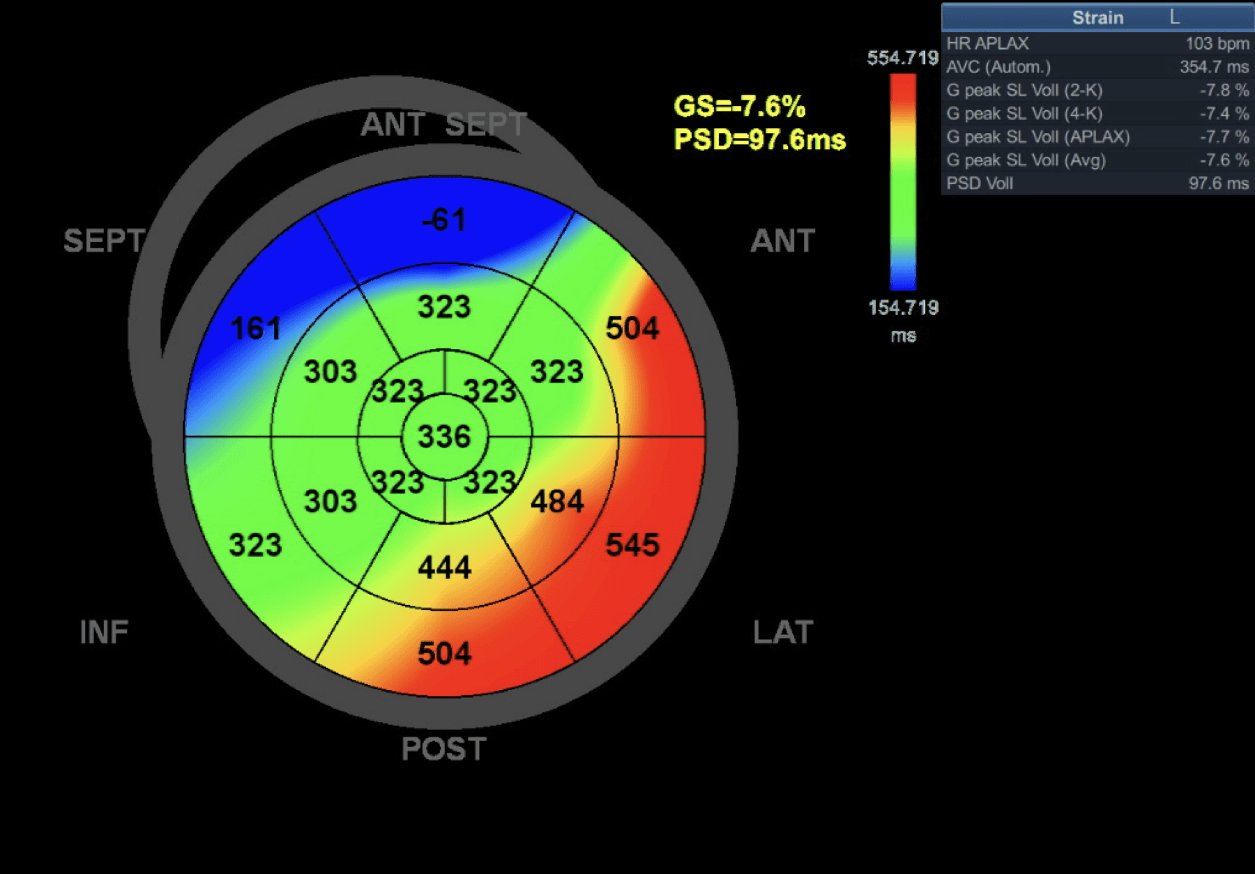 Standard deviation of the time until maximal segmental contraction. Dispersion Bullseye with different times to maximal contraction in relation to the heart cycle in a patient with amyloid heart disease & AFIB, with a globally severely prolonged Dispersion with 97.6ms