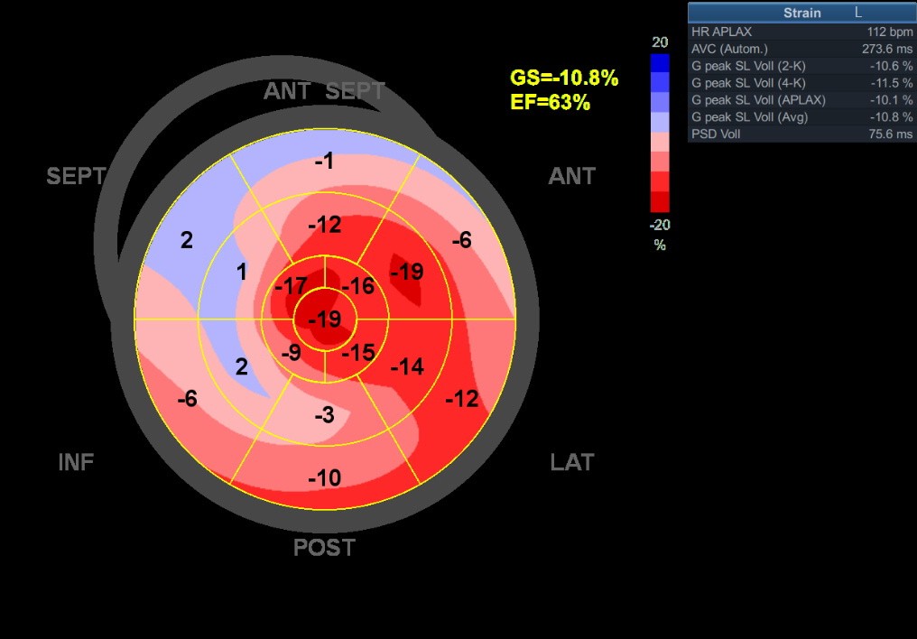 GLS more positive than -10% ➜ elevated risk for ventricular tachycardia / -10 to -16% ➜ worsening prognosis