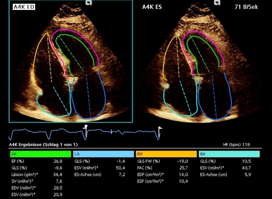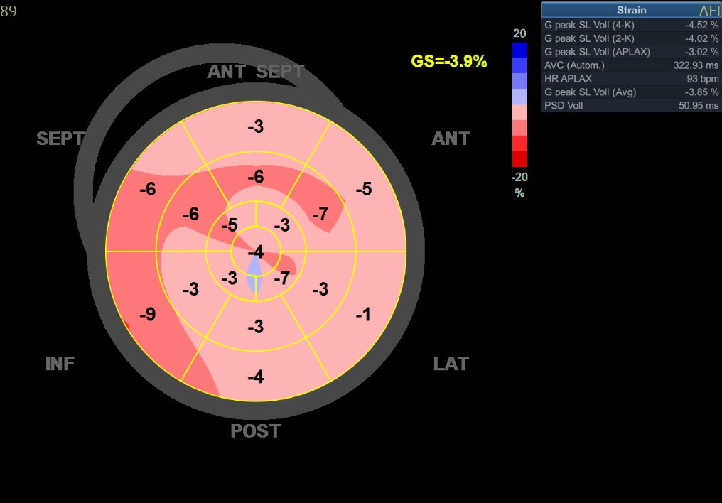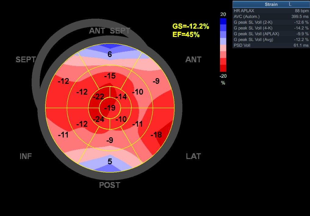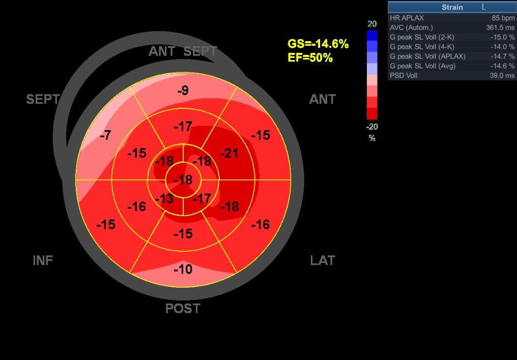 GLS severely reduced (-3,9%), moderately reduced -12,2% (HFimpEF), mildly reduced -14,6% (HFpEF)